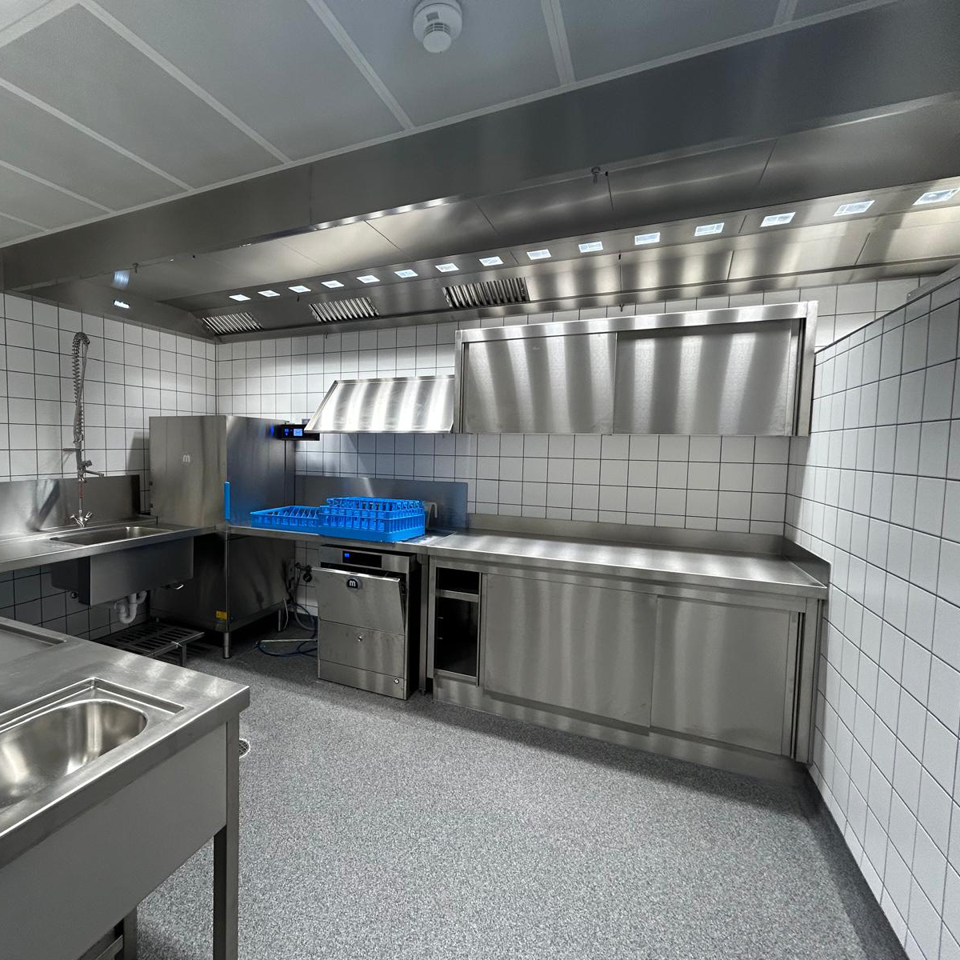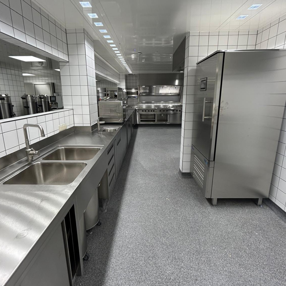 Verbaut wurde modernste Großküchentechnik von MKN, darunter die Masterline Kochblöcke, Kombidämpfer und FlexiChef-Systeme, von CoolCompact die Kühltische, Tiefkühltische sowie Kühlschränke. Zudem Coldline-Kühltische, MEIKO Spültechnik, Hupfer Regalsysteme sowie Edelstahl-Sonderbau von HKU.